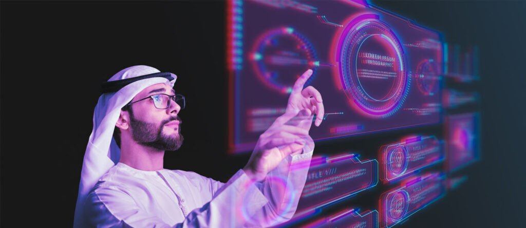 This image depicts a futuristic conceptual scene featuring a man interacting with a holographic user interface. Photo courtesy of Gulf News